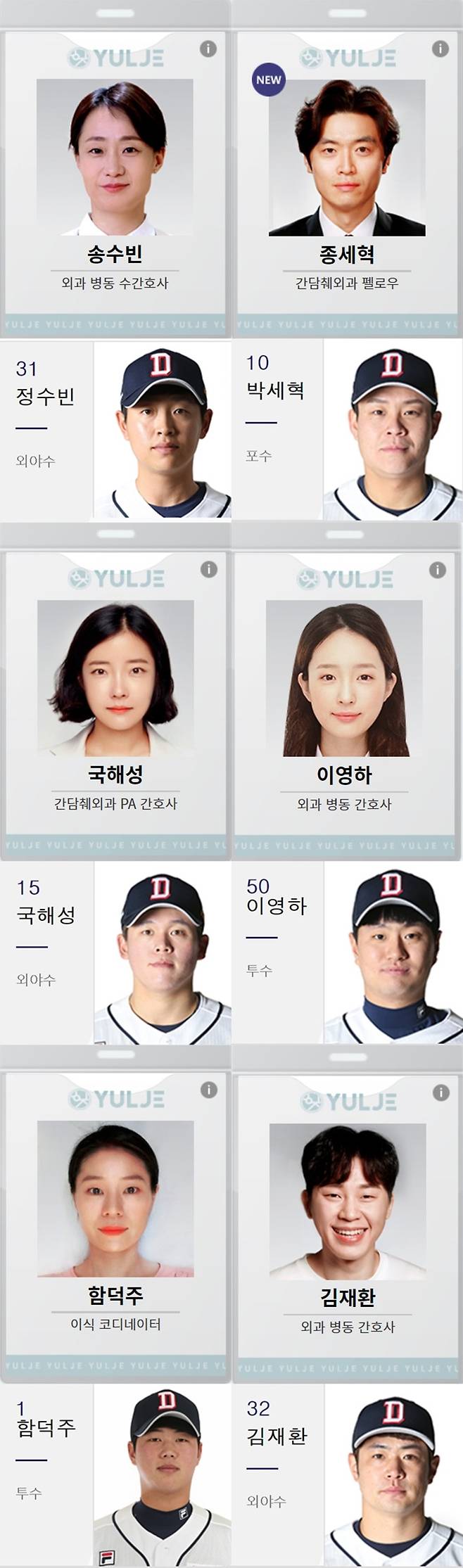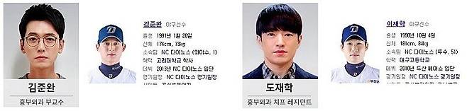 흉부외과 김준완(정경호)은 NC 다이노스의 김준완 선수, 도재학(정문성)은 투수 이재학을 떠올리게 한다. 산부인과 추민하(안은진)는 한화 이글스의 김민하 선수, 명은원(김혜인)은 정은원 선수와 유사하다.