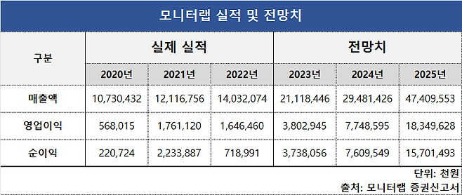 모니터랩은 매출액이 2023년 211억원, 2024년 295억원, 2025년 474억원을 기록할 것으로 추정했다. 지난해 매출액 140억원이 3년 만에 3배 이상 불어날 것이라고 예상한 것이다. 같은 기간 영업이익은 38억원, 77억원, 183억원으로 관측했다. 이에 따라 지난해 7억원 수준이었던 순이익은 2025년 22.4배 늘어난 157억원을 달성할 것이란 설명이다.