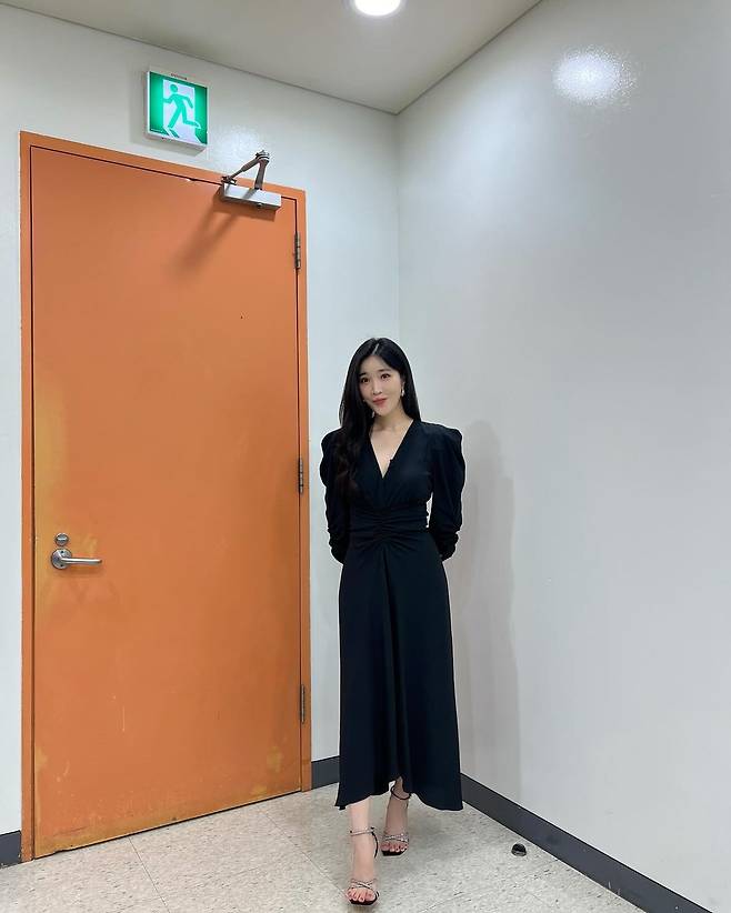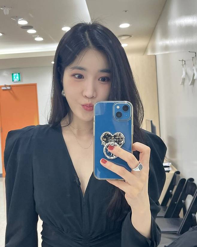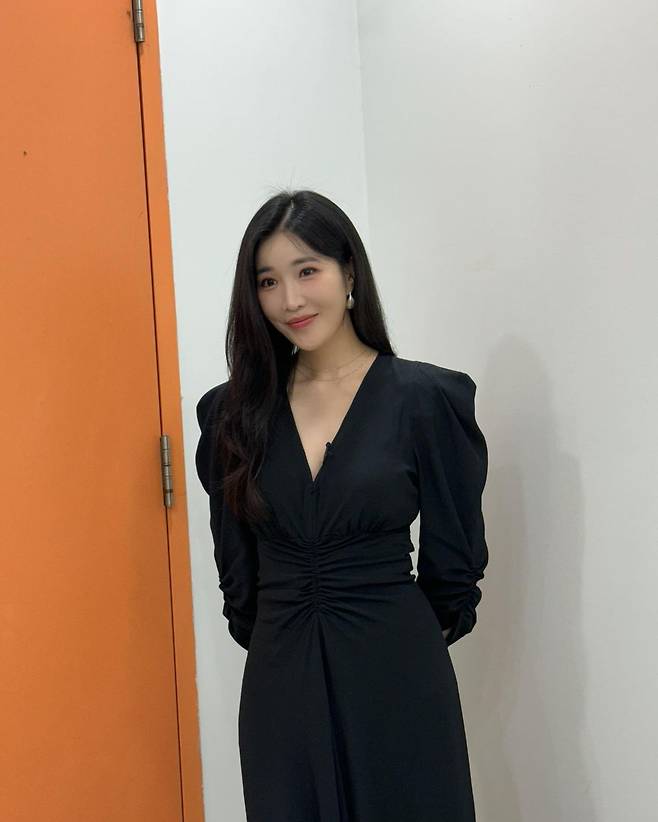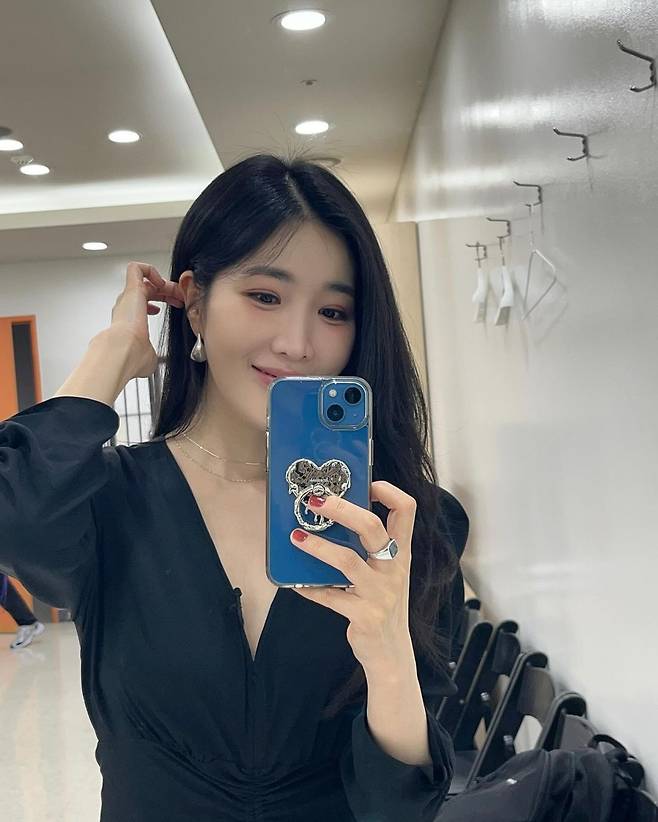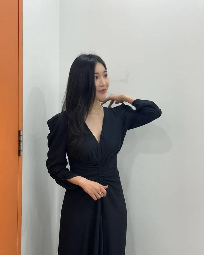 사진 속 이해리는 블랙 브이넥과 어깨의 셔링이 있는원피스를 입고 단아한 코디를 자랑했다.