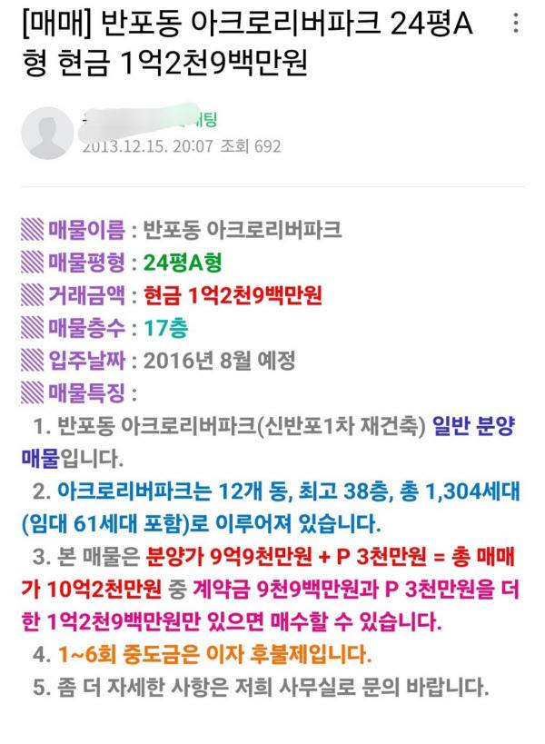 16일 온라인 부동산 커뮤니티에 올라온 게시글에 따르면, 2013년 서울 서초구 반포동 신반포1차 재건축 아파트인 ‘아크로리버파크’ 전용 59㎡(약 25평) 분양권 매물이 10억2000만원에 올라 왔다. 당시 해당 평형 분양가는 9억9000만원, 여기에 프리미엄 3000만원이 더해진 금액이다. 현재는 전용 59㎡ 기준 시세가 40억원 안팎에 형성돼 있다. 분양가와 비교하면 30억원 이상 오른 셈이다. 단순 계산으로 연평균 2억5000만원씩 오른 셈이며, 시세 상승률로 따지면 300%에 육박한다.