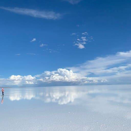우유니 소금사막의 가장 큰 매력은 우기(12월~4월) 때 볼 수 있는 거울 같은 풍경입니다. 얕게 고인 빗물이 하늘을 그대로 반사해 마치 하늘과 땅의 경계가 사라진 듯한 환상적인 광경을 연출하죠. 이 시기에 우유니를 방문하면 마치 하늘 위를 걷는 듯한 신비로운 경험을 할 수 있습니다.