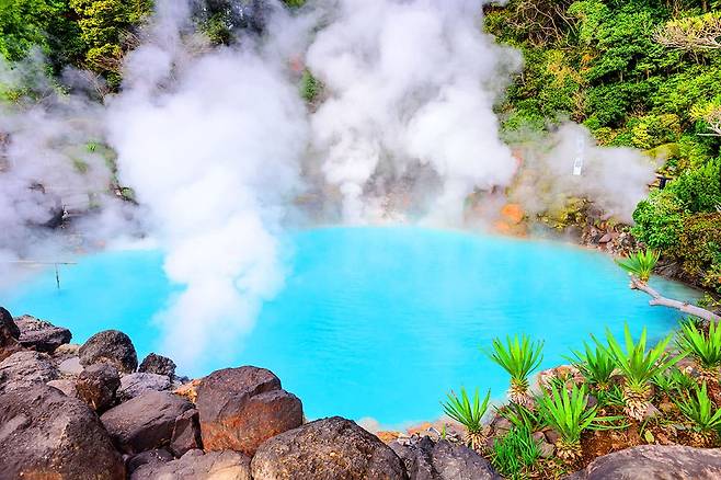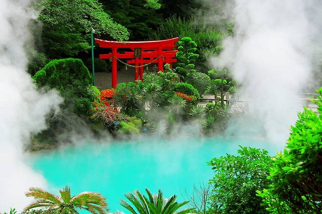 우미 지고쿠는 약 1,200년 전 화산 폭발로 인해 형성된 온천으로, 이름 그대로 바다를 닮은 푸른 색의 온천수가 특징입니다.