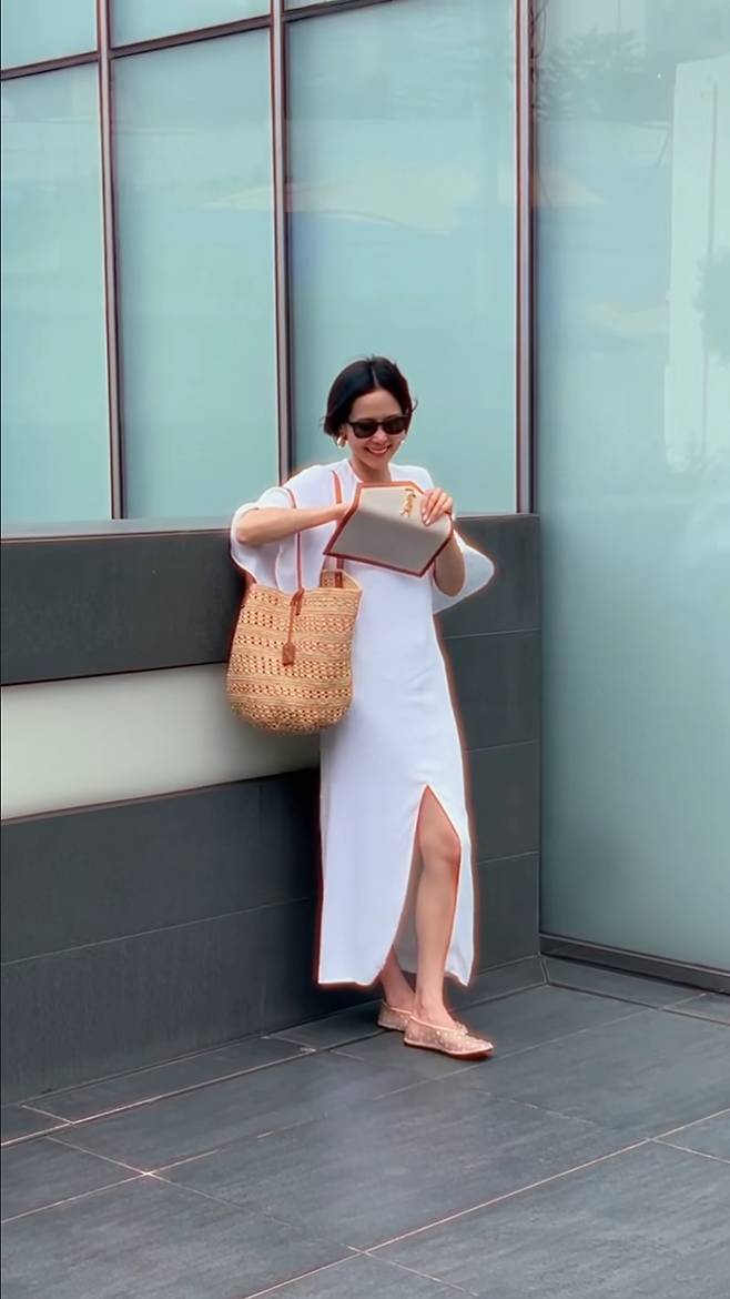 김나영은 통이 넓고 트임이 있는 화이트 원피스를 착용해 시원하고 깔끔한 패션을 선보였습니다.