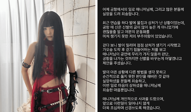 그는 "최근 연습을 하다 발에 물집과 상처가 난 상황이었는데, 공항 때 신은 신발의 굽이 많이 높은 게 아니었기에 괜찮을줄 알고 여분의 운동화를 미처 챙기지 못한 저의 부주의함이 있었다"고 입을 열었습니다.