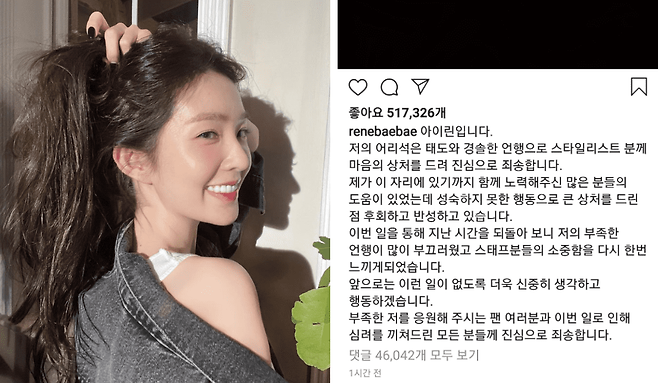 이어 "이번 일을 통해 지난 시간을 되돌아 보니 저의 부족한 언행이 많이 부끄러웠고 스태프분들의 소중함을 다시 한번 느끼게 되었습니다."라고 전한 아이린은 "앞으로는 이런 일이 없도록 더욱 신중히 생각하고 행동하겠습니다. 부족한 저를 응원해 주시는 팬 여러분과 이번 일로 인해 심려를 끼쳐드린 모든 분들께 진심으로 죄송합니다."라고 거듭 사과를 전한 바 있습니다.