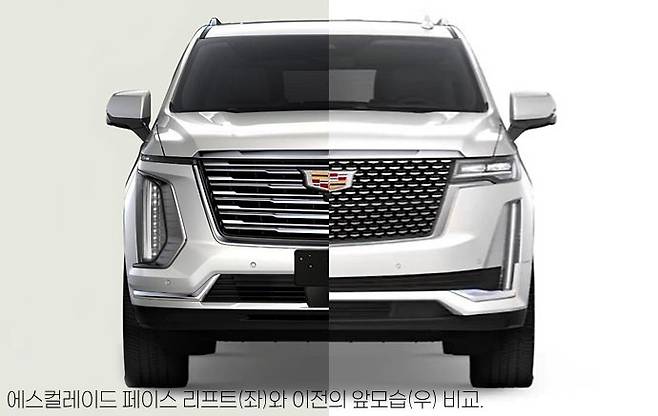 페이스 리프트 된 앞 모습은 최근의 캐딜락 전기동력 차량과 유사한 세로형 헤드램프에, 마치 방패를 연상시키는 커다란 캐딜락 심벌 등을 적용해 큰 폭으로 바뀌었습니다.