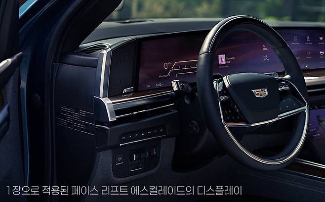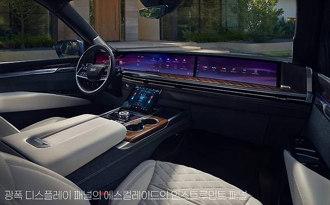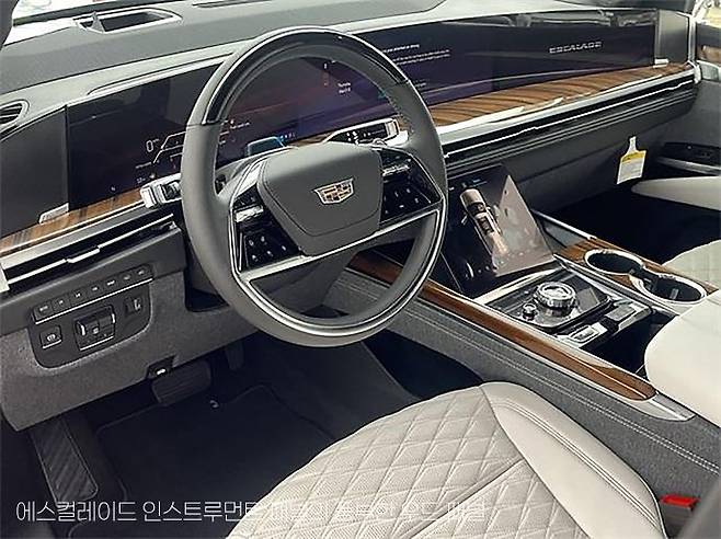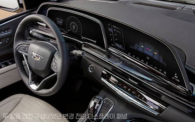 페이스 리프트 모델이지만, 실내의 디자인 변화는 꽤 큽니다. 인스트루먼트 패널에서 운전석 디스플레이 패널이 전에는 두 장을 겹쳐 놓은 것 같던 구성에서 이제는 좌우로 길게 한장처럼 구성된 건 물론이고 조수석에도 긴 디스플레이 패널이 들어가 있어서 그야말로 인스트루먼트 패널 전체가 파노라마 디스플레이 패널로 구성돼 있습니다. 그리고 인스트루먼트 패널의 디스플레이 패널 바로 앞쪽에 마치 선반처럼 원목 패널이 좌우로 길게 놓여 있어서 전형적인 미국식 자동차의 감성을 풍깁니다.