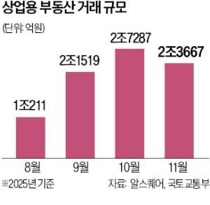 8일 상업용 부동산 전문기업 알스퀘어에 따르면 지난해 11월 서울 상업·업무용 건물 거래 규모는 2조3667억원, 거래 건수는 177건으로 집계됐다. 지난해 10월(2조7287억원, 149건) 대비 거래 규모는 13.2% 감소했지만, 거래 건수는 18.8% 늘었다. 초대형 오피스 거래가 줄어든 대신 중소·중형급으로 거래 저변이 넓어진 영향으로 풀이된다.