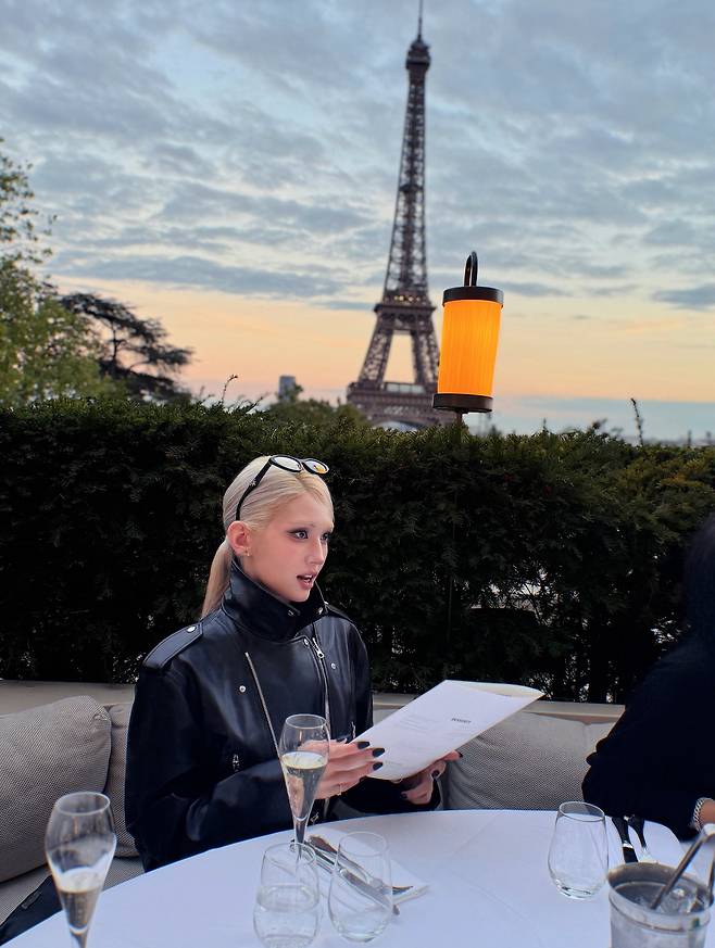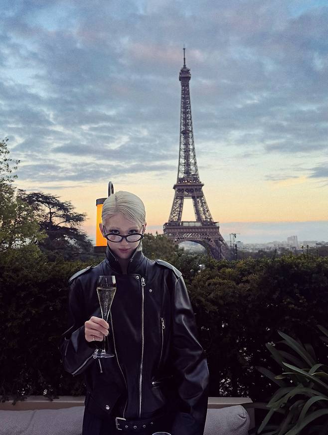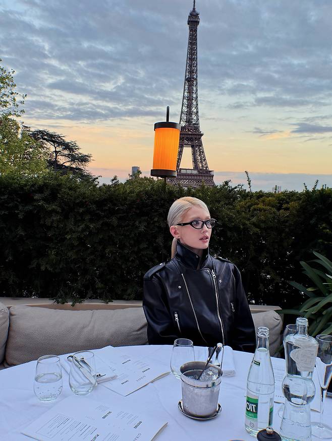 에펠탑을 배경으로 한 저녁 하늘 아래, 블랙 가죽 재킷 하나로 모든 무드를 장악했어요.