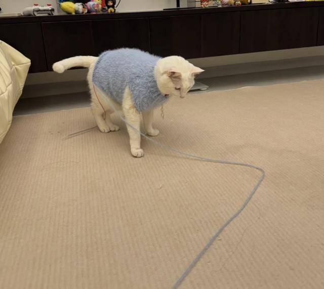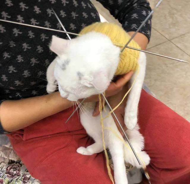그런데 니트를 만드는 바늘이 마치 고양이에게 족쇄를 채우고 있는 것처럼 위험해 보이기도 합니다.