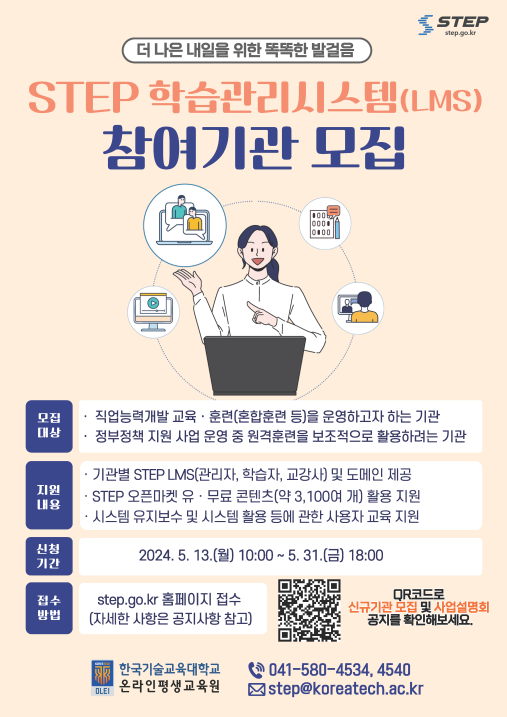 한국기술교육대학교(총장 유길상) 온라인평생교육원은 ‘2024년도 상반기 스마트 직업훈련 플랫폼 ’스텝‘의 학습관리시스템(LMS) 지원사업 참여기관을 모집한다.