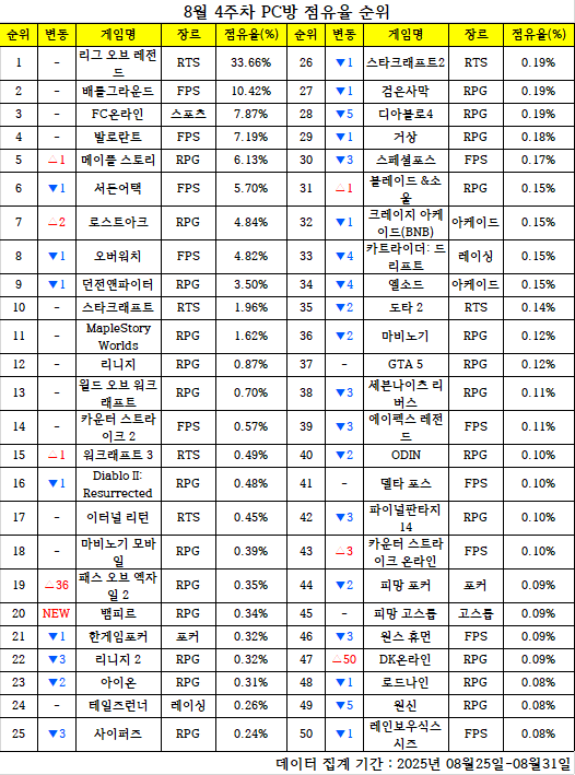 한 주간의 PC방 순위를 되짚어 보고, 어떤 변화가 있었는지 알아보는 'PC방순위' 코너입니다. 데일리게임은 매주 PC방 순위를 일목요연하게 정리, 독자들이 알아보기 쉽도록 제공합니다. 지난 한 주간 어떤 PC 온라인게임들이 눈길을 끌었는지 살펴봤습니다. < 편집자주 >