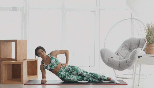 매트에 오른쪽 팔뚝을 대고 옆으로 누운 뒤 왼손은 옆구리에 둡니다. 엉덩이를 들어 사이드 팔꿈치 플랭크 자세를 만든 후, 엉덩이를 내렸다가 들어 올리는 업다운 동작을 반복합니다. 반대편으로 돌아 누워 같은 방식으로 진행합니다.