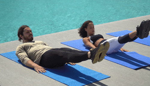 매트에 등을 대고 누운 뒤 손을 머리 뒤로 잡습니다. 상체를 약간 일으킨 상태에서 다리를 공중에 띄웁니다. 복부에 힘을 주며 압박하고, 이 자세를 유지한 채 버팁니다.