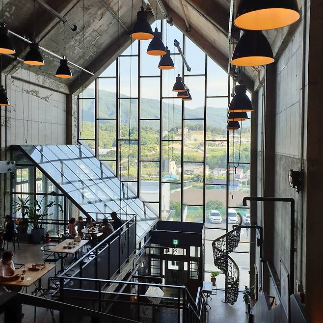 창문 너머 기가 막힌 산 뷰를 만날 수 있는 카페. 인적이 드문 외딴 시골길에 붉은 벽돌의 3층 건물이 눈에 보인다. 고요한 공기에 둘러싸여 카페로 향하면 넓은 마당과 거대한 전면 유리창이 눈길을 끈다. 밖에서는 하늘과 구름을 그대로 담고, 안에서는 대룡산 주변 산을 품었다. 3층 규모의 이곳은 1층은 인더스트리얼 가구와 소품으로 꾸며져 있으며, 원형 계단을 올라가면 높은 층고에 격자무늬의 통유리 창문을 통해 아름다운 풍경을 감상할 수 있다. 인디커피 로스터리에서 직접 로스팅한 커피를 맛볼 수 있다.