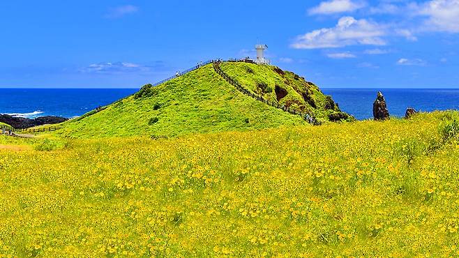 섭지코지의 풍경이 가장 화사하게 바뀌는 시기는 봄이다. 특히 3월이 되면 해안 언덕 곳곳에 유채꽃이 피어나며 노란 꽃밭이 형성된다.