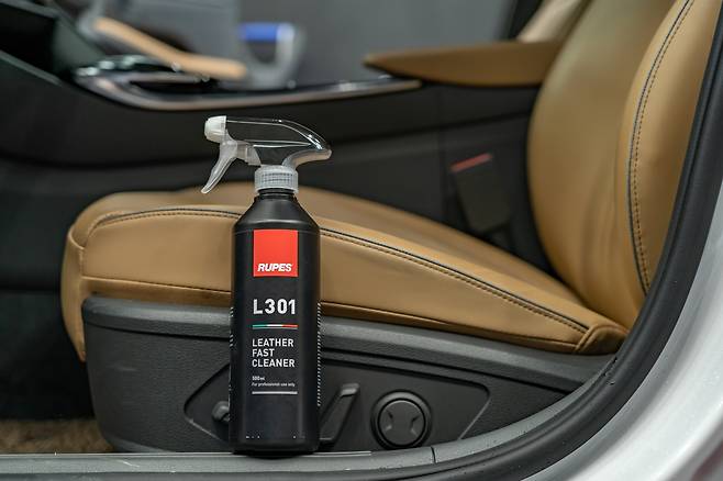 먼저 사용할 제품은 ‘루페스 L301 레더 패스트 크리너’. 가죽 표면의 먼지, 그리스, 유기물질, 흙먼지 등 오염물질을 안전하고 효과적으로 제거할 수 있는 제품이다. 가죽의 색상을 변색시키지 않을 뿐 아니라 사용 후 끈적거리는 느낌이 없으며, 자외선 차단 효과도 얻을 수 있다.