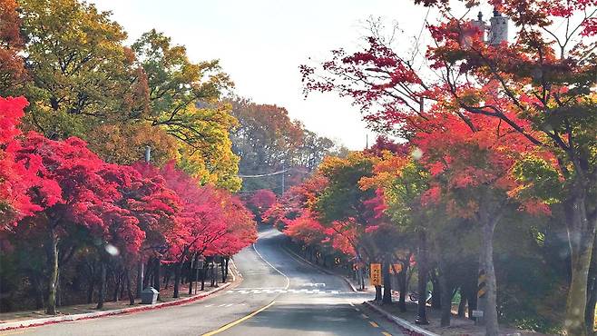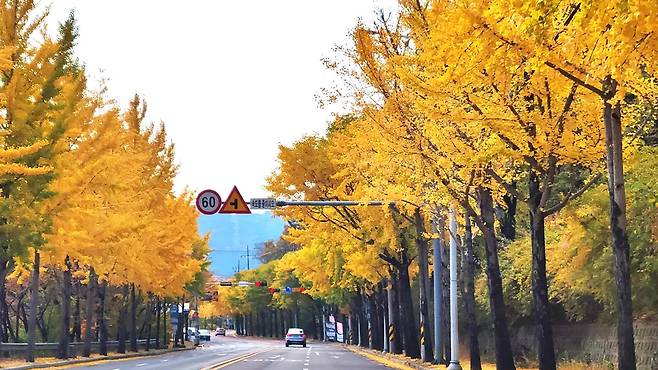 팔공CC삼거리~파계사삼거리 구간은 10월 말~11월 초, 단풍과 은행나무가 만든 황홀한 터널로 변한다.