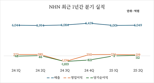 NHN은 올해 2분기 연결기준 매출 6049억원, 영업이익 219억원을 기록했다. 매출은 전년 동기 대비 0.9% 증가했지만 영업이익은 전년 동기 대비 23.0% 줄었다. 순이익은 지난해 3분기부터 이어진 적자 행렬을 끊고 112억원을 기록했다.