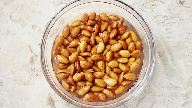 불린 아몬드를 준비하는 방법은 비교적 간단하다. 깨끗한 물에 아몬드를 담가 8~12시간 정도 불리는 것이 기본이다.