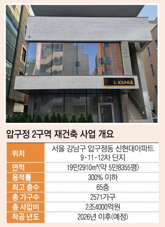 압구정 2구역은 1982년 준공된 신현대아파트 9·11·12차 단지로 용적률 300% 이하, 최고 65층, 2571가구(임대주택 321가구 포함) 규모의 초고층 아파트로 재탄생할 예정이다. 압구정 6개 구역 중 유일하게 정비계획안이 통과되면서 사업 속도가 가장 빠르다는 평가를 받고 있다.