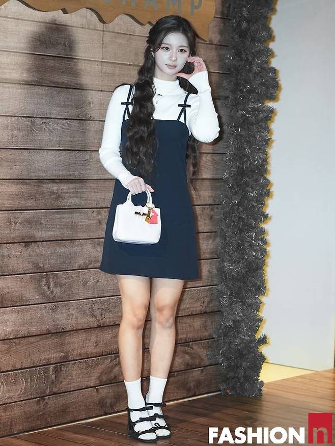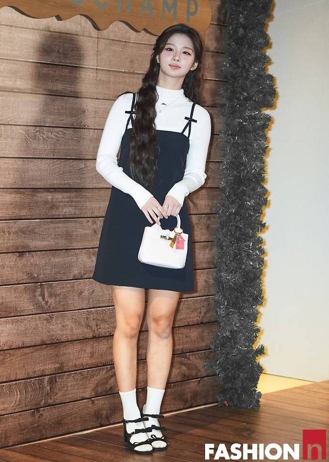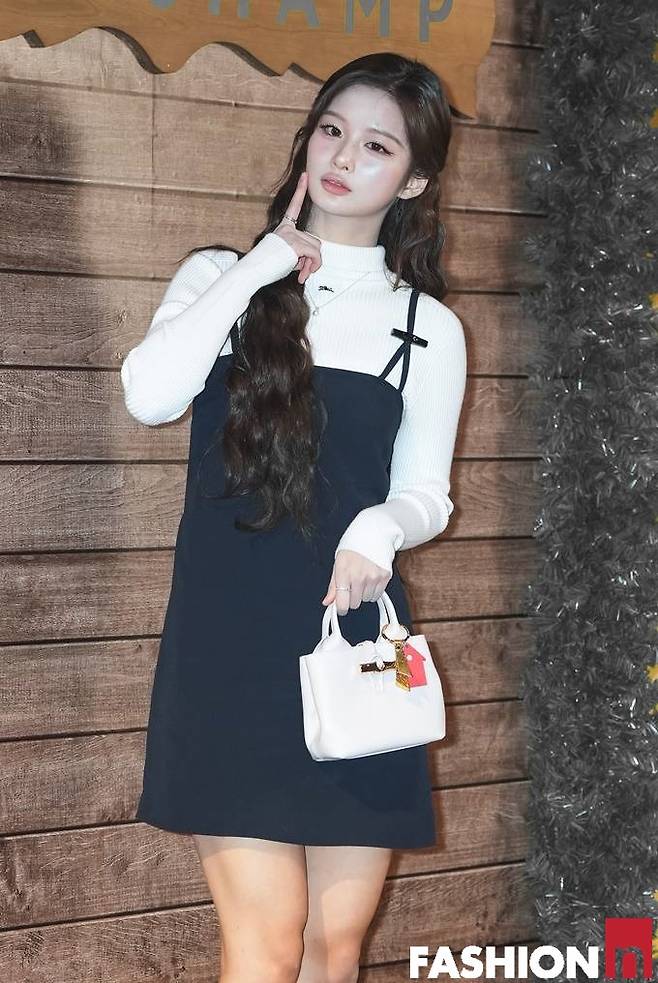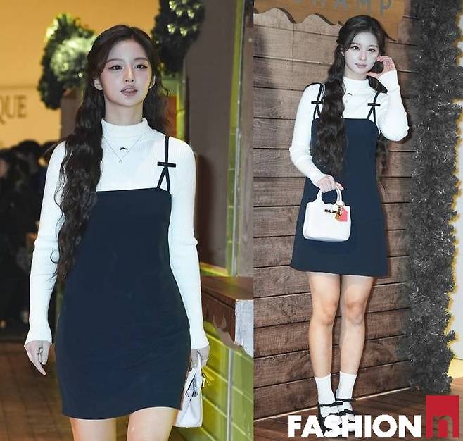 이날 설윤은 화이트 베이지 터틀넥 니트와 레이어드한 블랙 튜브탑 원피스, 여기에 화이트 삭스를 매치한 겨울 걸리시룩으로 행사장을 밝혔다.