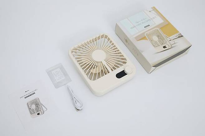 박스 안에는 구성품으로 머레이 디퓨저 미니 다이얼 선풍기 WINDBOOK 본체와 USB 케이블, 고체 방향제, 그리고 사용 설명서가 들어 있다.