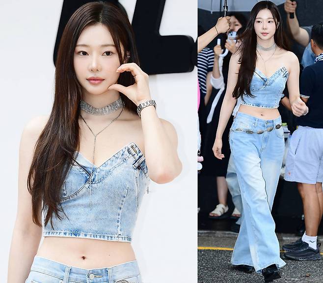 이시안은 언밸런스 커팅이 돋보이는 데님 브라톱에 와이드 한 라이트블루 데님 팬츠를 매치해 ‘청청 패션’의 정석을 보였습니다.