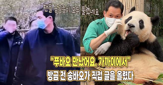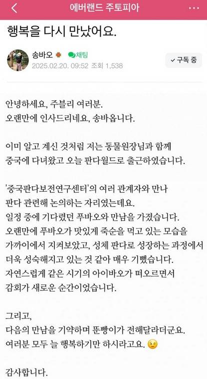 이날 네이버 카페에 글을 올린 송 주키퍼는 '행복을 다시 만났어요'라는 제목으로 글을 올렸스빈다. 그는 "이미 알고 계신 것처럼 저는 동물원장님과 함께 중국에 다녀왔고 오늘 판다월드로 출근했습니다"라고 말했습니다.