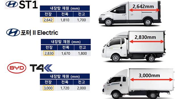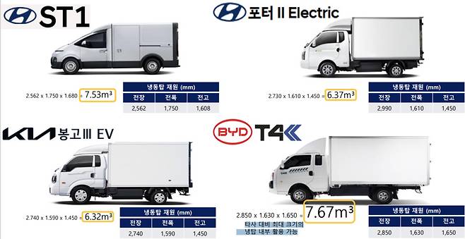 4대의 냉동 탑차 중 T4K(전장 2,850mm, 전폭1,630mm, 전고1,650mm)가 7.67m³로 제일 길며 ST1(전장 2,562mm, 전폭1,750mm, 전고1,608mm)이 7.53m³으로 2위, 포터2 일렉트릭(전장 2,990mm, 전폭1,610mm, 전고1,450mm) 6.37m³, 기아 봉고3 EV(전장 2,740mm, 전폭1,590mm, 전고1,450mm)가 6.32m³로 뒤를 잇는다.