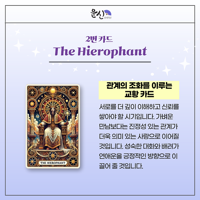 교황 카드는 신뢰와 안정적인 관계를 의미합니다. 지금 연애운에서는 단순한 감정보다 깊이 있는 소통과 책임감 있는 태도가 중요하게 작용합니다.