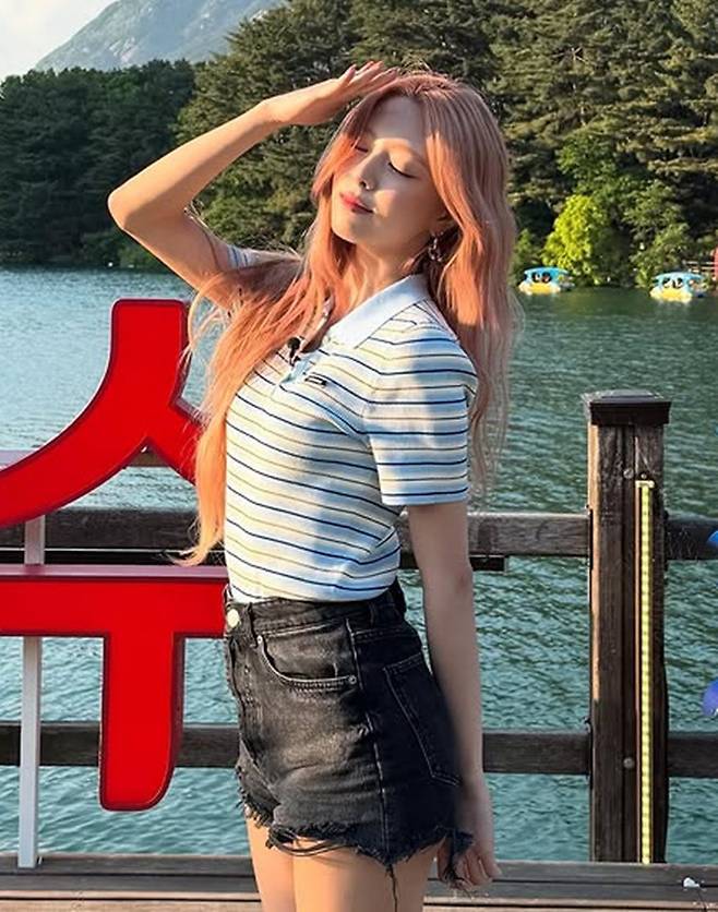 이날 유나는 보기만 해도 시원한 반팔 스트라이프 반팔 니트 셔츠와 다크 그레이 데님 쇼츠를 매치한 핫섬머룩으로 군살 1도 없는 각선미를 뽐냈다.