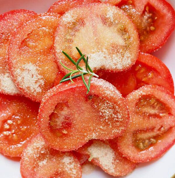 잘 익은 토마토와 찰떡궁합을 자랑하는 것이 설탕이다. 설탕을 절여 만든 토마토 절임이 인기일 정도로 많은 사람들이 즐겨 먹는다. 그러나 토마토 안에는 비타민B와 무기질 성분이 가득한데 설탕과 함께 먹게 되면 이 비타민과 무기질이 설탕을 분해하기 위해 사용된다고 한다. 이 때문에 비타민과 무기질을 우리 몸에 흡수하지 못해 영양소로 쓰지 못한다고 한다. 따라서 효과적인 영양소 흡수를 위해서는 토마토를 따로 먹는 것이 좋다.