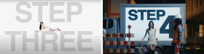 두 번째는 뮤직비디오 역시 가사 ‘STEP’을 활용한 점인데요, 타이포그래피의 시각적 연출이 주는 강조 효과를 통해 가사에 대한 기억을 강하게 만들어 주고 있습니다.