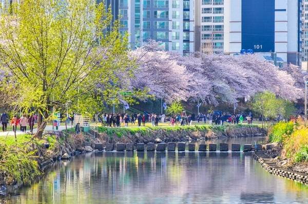 연제구와 동래구를 흐르는 온천천을 따라 조성된 온천천시민공원은 강변을 따라 길게 이어진 산책로와 자전거길 양옆으로 벚나무가 줄지어 있어 벚꽃시즌 부산 시민들이 가장 많이 찾는 부산 벚꽃 명소입니다.