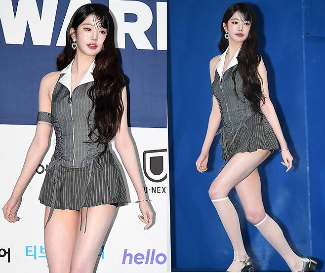 장원영은 화이트 카라가 돋보이는 그레이 핀스트라이프 탑과 미니스커트를 선택해 세련된 매력을 발산했습니다.
