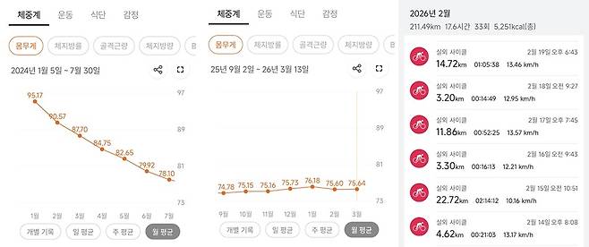 물론 과정이 항상 순탄했던 것은 아니다. 갑작스럽게 운동량을 늘리면서 왼쪽 오금과 오른쪽 무릎에 통증이 찾아오기도 했다. "이쯤에서 그만둘까"라는 생각도 들었지만 무릎 보호대를 착용하고 운동 강도를 조절하면서 위기를 넘길 수 있었다.
