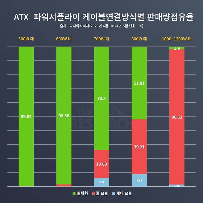 다나와 리서치 자료를 보면 다나와에서 판매되는 500~600W 대 파워서플라이 제품군에서는 풀모듈이나 세미 모듈 방식은 거의 찾아볼 수 없고 대부분 일체형이다. 700W 대 제품군부터 풀모듈 방식이 19.89% 수준으로 팔리기 시작한다. 800W 대 제품군에선 39.21%가 풀모듈 방식이다. 고출력 파워서플라이로 구분되는 1000~1200W 대 제품군에서는 무려 96.62%가 풀모듈 방식으로 나타났다.