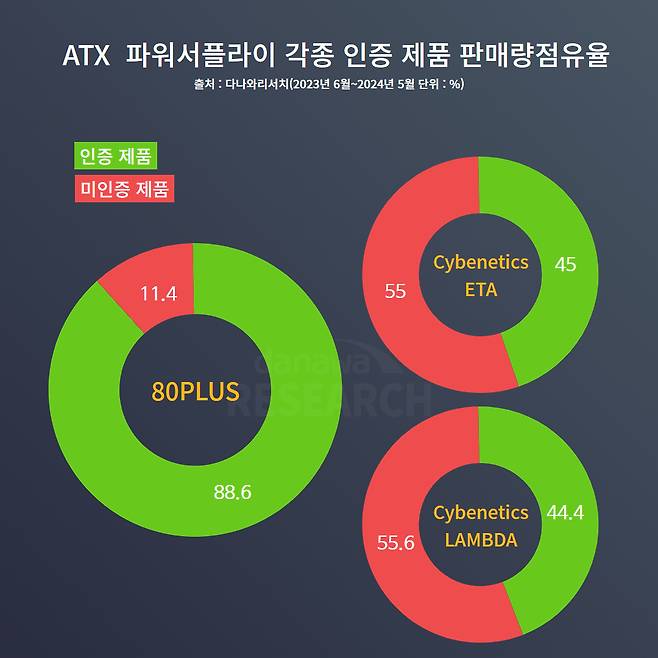 그만큼 효율이나 안정성이 중요하게 부각되기 때문에 해당 인증을 받은 제품이 주목받는 것도 유념해야 한다. 파워서플라이 시장의 대표적인 효율성 인증은 2004년부터 등장한 80PLUS 계열이다. 20년이 넘는 세월을 거쳐왔기 때문에 다나와에서 판매되는 파워서플라이 제품 중 88.6%가 80PLUS 인증을 받은 제품이다. 물론 티타늄부터 브론즈까지 단계를 막론하고 집계된 수치다.