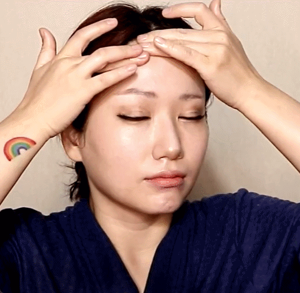 다음은 미간을 X자로 교차해 줄게요. 양쪽 눈썹 앞머리부터 사선으로 미간을 교차하며 미간주름을 풀어주는 동작이에요. 굳어있는 미간근육이 풀어지며 얼굴 전체에 혈액순환을 도와요.