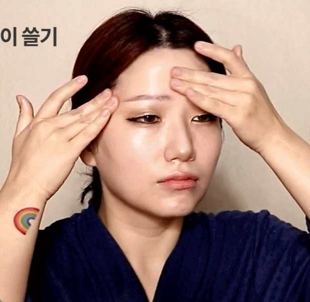 미간에서 시작해서 관자놀이까지 쓸어내려주세요. 미간의 주름을 이완하고 직접적으로 주름을 펴주는 동작이에요.
