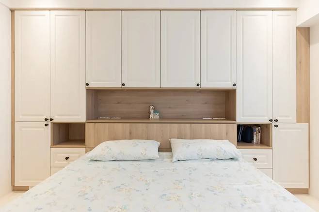 안방은 공용 공간의 스타일을 이어받으며, 차분한 톤으로 침실의 기능을 강화했다. 마주보는 수납장이 시각적으로 공간을 확장시키고, 침대는 사용자의 신체 조건에 맞춰 맞춤 제작되었다.