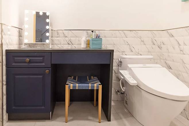 블루 톤의 수납장과 골드 테두리의 타일이 조화를 이루어 고급스러운 분위기를 완성한다. 자연광이 잘 들어오는 구조 덕분에 거울과 장식이 돋보이면서도 실용적이다.