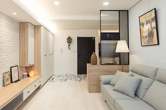 중고 아파트의 현관은 낮은 대들보가 특징적이다. 그러나 디자이너는 빛과 구조를 활용해 이러한 시각적 답답함을 극복했다. 천장은 입구에서 계단식으로 낮아지며 부드러운 리듬을 만들고, 선반 위에 설치된 은은한 조명은 입구를 밝히고 공간감을 확장한다.