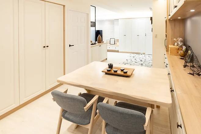 식기와 전자기기 사용에 최적화된 수납장과 슬라이딩 구조의 설비는 실용성과 미적 가치를 모두 충족시킨다. 벽면에는 가족의 여행 추억이 담긴 굿즈와 사진이 전시되어 있어 개인적인 이야기가 가득하다.