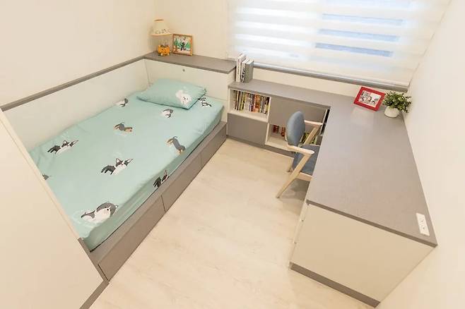 큰아들의 방은 간결하면서도 남자 아이의 개성을 반영했다. 화이트와 라이트 그레이를 기본으로 깔끔한 분위기를 유지하며, 침대 하단에 전용 수납공간이 설계되어 있다. 장식보다는 실용성에 중점을 둔 점이 특징이다.