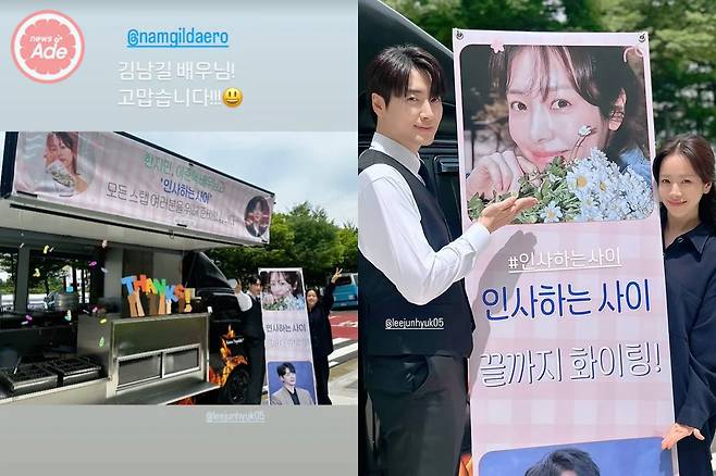 새 드라마 '인사하는 사이'에서 호흡을 맞출 예정인 두 사람은 배우 김남길이 보낸 간식 차 앞에서 포즈를 취하고 있는 모습을 공개해 기대를 모으는 데 성공했습니다.