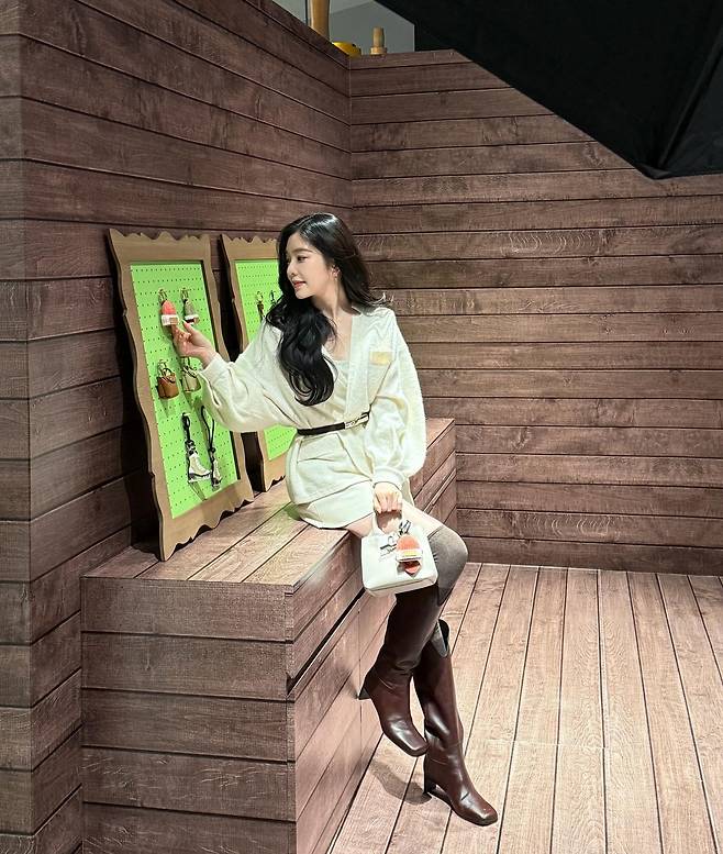 가디건과 톤을 맞춘 미니스커트를 매치해서 전체적으로 통일감 있는 화사한 겨울룩을 완성했어요.