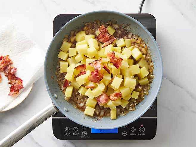 양념이 끓어오르면 삶아둔 감자와 베이컨 절반을 넣고 3~4분간 가볍게 섞으며 익힙니다.