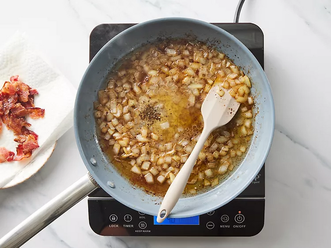 같은 팬에 잘게 썬 양파를 넣고 베이컨 기름에 볶습니다. 6~8분 정도 갈색이 나도록 볶아 향을 냅니다.